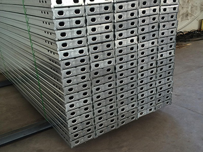 钢跳板排凸孔描绘,既可以减轻自重,一边又起到防滑、防变形。两边工字型描绘增加了牢度和强度、防积沙,更使其外型美观大方、坚固耐用。钢跳板外形描绘使其更易捆吊和装置,闲时堆积整齐划
