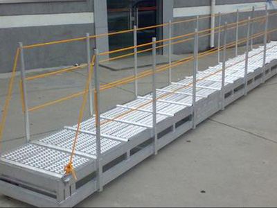 铝合金坯料经轧制成厚度为50~120mm,宽度为250~1 300mm的细长活动踏板。材质有防锈铝、硬铝、超硬铝及锻铝等。铝合金弹性模量小(E=66 640~70 560MPa、G=26 460MPa,相当于钢材的三分之一),受到冲击时,所吸收的弹性变形能高,不易破坏,并有比强度高、耐蚀等特性。常用于港口、码头的跳板及建筑工程的脚手板。